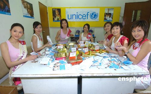 參加《2005年度香港小姐競選》20位候選佳麗9日來到香港聯(lián)合國兒童基金會﹐將社會捐助的各種錢幣進行整理﹐以此來表達對有需要人士的幫助。作者:趙振清