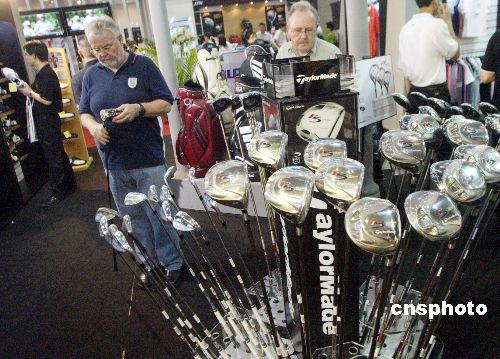 六月十一日,在北京舉行的2005第四屆中國(北京)國際高爾夫球博覽會吸引眾多中外參觀者。圖為外國客商在仔細觀賞精美的高爾夫球具。作者:錢興強