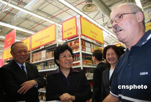 中國國務院僑辦主任陳玉杰(左二)一行當地時間六月十一日來到法國華人最大的企業之一陳氏兄弟公司總部參觀,同陳氏集團董事長陳克威(左一)進行了會談。圖為陳玉杰與購物的法國顧客交談。作者:鐘誠