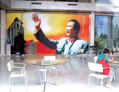 北京市朝陽區楊閘環島附近的一個售樓處,毛主席揮手的大幅廣告赫然掛在該售樓處的玻璃幕墻內。該廣告由兩部分組成,左下角是幾個住宅樓的圖片,毛主席揮手的照片占用了三分之二的畫面。
