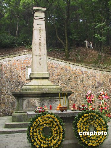 | 為紀(jì)念抗日戰(zhàn)爭勝利六十周年,曾是抗日戰(zhàn)場(chǎng)的風(fēng)景名勝地長沙岳麓山正在積極修繕陸軍第七十三軍抗戰(zhàn)陣亡將士公墓、清風(fēng)峽作戰(zhàn)指揮部、警察紀(jì)念堂、長沙會(huì)戰(zhàn)碑、陣亡將士名錄碑、古炮臺(tái)及戰(zhàn)壕遺址六處抗戰(zhàn)歷史遺跡,緬懷先烈。圖為由蔣介石題詞的陸軍第七十三軍抗戰(zhàn)陣亡將士公墓。作者:劉雙雙
