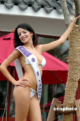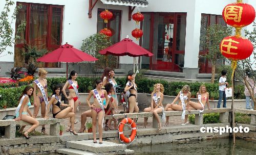 六月二十二日,參加國際旅游小姐最佳民族服裝冠軍大賽的七十五位佳麗在“中國第一水鄉”古鎮周莊奉獻了一場比基尼泳裝秀,盡情展示她們大膽、外向的美麗。作者:蔣振江