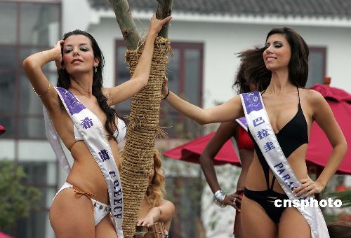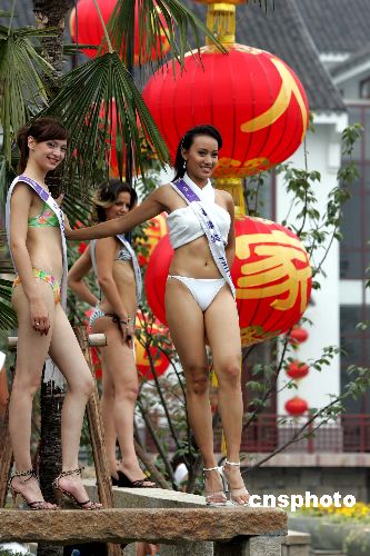 六月二十二日,參加二零零五年國際旅游小姐大賽的佳麗們身著泳裝在水鄉周莊亮相拍照。作者:毛建軍