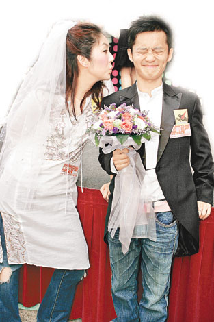 中新網6月28日電 據香港媒體報道,楊千嬅和林一峰昨日到銅鑼灣,出席《拉闊音樂會》的露天記者會,兩人以新郎新娘造型出現扮結婚,他們更即場作狀簽字和交換戒指,但簽字時突然下雨,搞到兩人十分狼狽,千嬅笑言連老天都反對兩人結婚,當千嬅讀誓詞時又忍不住笑,最后她把花球拋給林一峰。