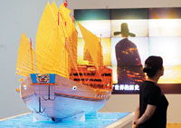 長四十四丈四尺(按1比40比例制作)的鄭和寶船、排水量達千噸以上的二千料海船(1比40比例)及出土文物——長達11.07米的明代大舵桿等在內的80余件(組)實物、190余幅圖版將于7月6日正式與游客見面,它們是國家博物館舉辦的《云帆萬里照重洋——鄭和下西洋600周年紀念展》的主角,昨天是試展的第一天。