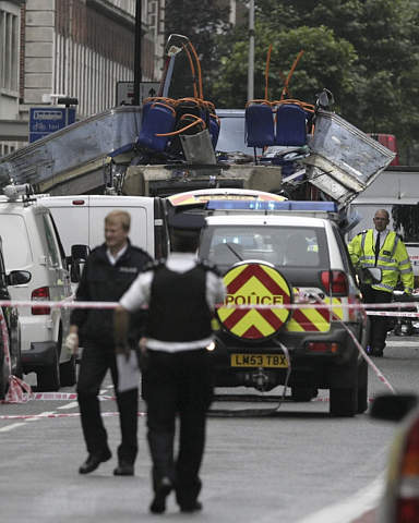 中新網7月7日電 英國警方稱,至少有兩人在今天倫敦公共汽車和地鐵發生的六起爆炸案中喪生。圖為在地鐵發生爆炸后在倫敦阿爾德加特東站門前工作的警察和消防隊員。(春風)
