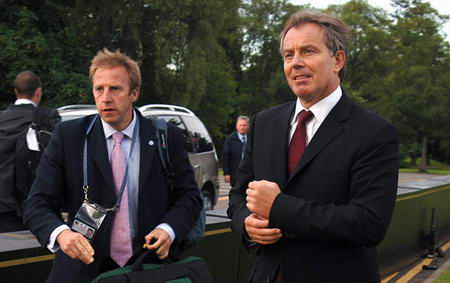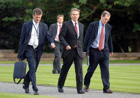 中新網7月8日電 7月7日晚些時候,英國首相布萊爾和助手從倫敦唐寧街10號返八國峰會。7月7日上午的英國倫敦爆炸事件造成了重大人員傷亡。(春風)
