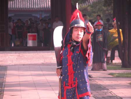 中新網7月9日電 在承德避暑山莊,每天早上八點“開園”時都會舉行熱鬧的清朝宮廷古裝儀式表演。