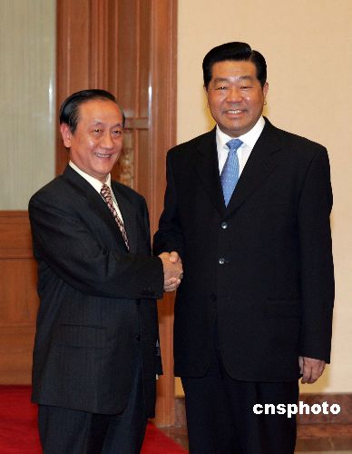 中共中央政治局常委、全國(guó)政協(xié)主席賈慶林七月十日在北京人民大會(huì)堂會(huì)見(jiàn)并宴請(qǐng)新黨主席郁慕明率領(lǐng)的臺(tái)灣新黨“民族之旅”訪問(wèn)團(tuán)。作者:毛建軍