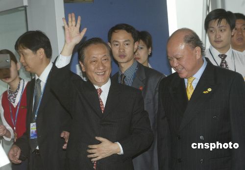 臺灣新黨主席郁慕明率領(lǐng)的新黨大陸訪問團七月十三日結(jié)束對大陸的訪問離京返臺,郁慕明向往機場送行的人揮手致謝。作者:史利