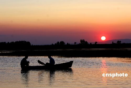 7月10日,新疆哈巴河縣巴依喬拉克濕地落日前漁民撒魚苗時的情景。哈巴河縣水利資源豐富,近年來,該縣拿出專項資金管護,使全縣各類濕地達200多萬畝,成了各種鳥類棲息的天堂。作者:金煒