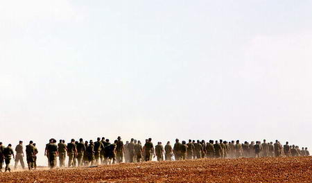 中新網7月20日電 據路透社報道,2005年7月19日,幾名正在巡邏的以色列士兵列隊走過加沙定居點的一處建筑物。