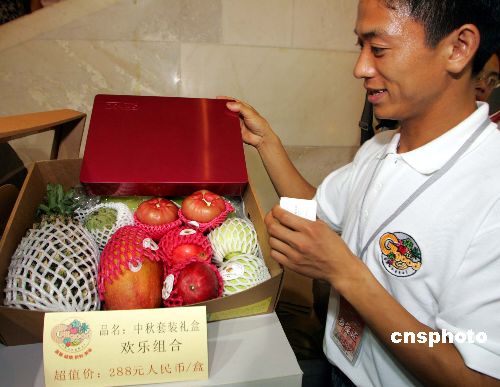 七月二十日,在上海舉行的臺灣農產品展銷會上,精明的上海臺商及時把握商機,將臺灣水果與月餅組合成中秋禮盒,及時地搭上“銷售快車”,成為展會亮點之一。作者:潘索菲