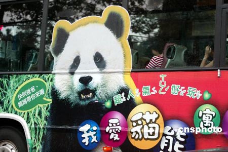 七月二十一日,一輛繪有大熊貓廣告畫(huà)的公共汽車在臺(tái)北忠孝東路上行駛。今年五月,大陸決定贈(zèng)送臺(tái)灣大熊貓以來(lái),在臺(tái)北民眾中掀起了大熊貓熱潮。作者:盛佳鵬