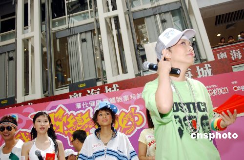 近期在香港熱播的電視劇《我的野蠻奶奶》劇組演員,7月24日在奧海城與觀眾近距離接觸,讓市民一睹眾明星風(fēng)采。圖為飾演奶奶的汪明荃一身搖滾打扮登臺與觀眾會面玩游戲派“利是”。
