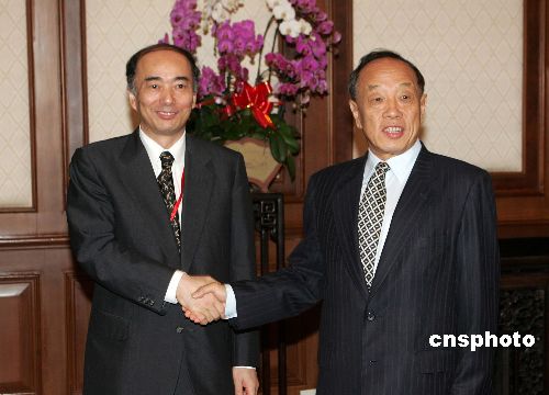中國外交部長李肇星七月二十五日在北京釣魚臺國賓館會見并宴請前來出席朝核問題六方會談的日本外務省亞大局長佐佐江賢一郎。作者:毛建軍