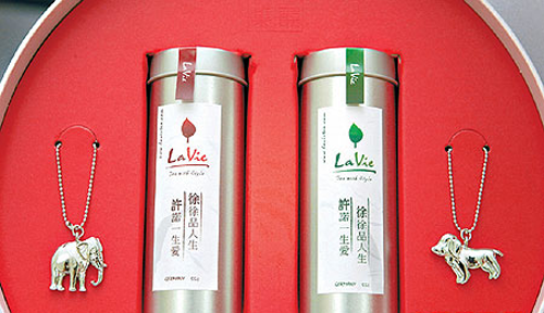 訂婚禮盒中包括西式餅盒及茶葉禮盒,餅盒是幸福的心型,茶葉禮盒并附有大象和狗的項錬,這都是她最喜愛的動物。