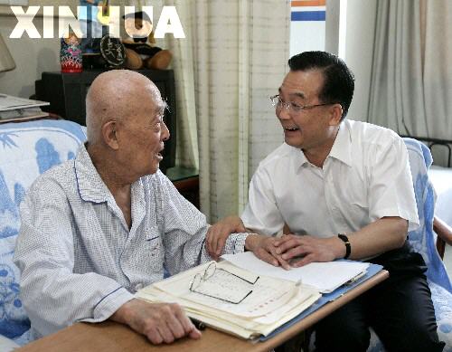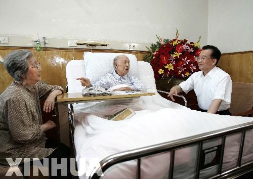 隨后,溫家寶來到“人民科學(xué)家”錢學(xué)森的病房,送上鮮花,向這位共和國航天科技事業(yè)的先驅(qū)表示慰問和敬意。