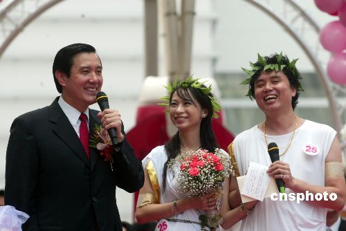 七月三十日,“戀戀愛之船-市民聯合婚禮”在臺北美麗華百樂園摩天輪廣場舉行,三十四對新人在此喜結良緣。臺北市長馬英九(左)在婚禮上當眾向新人提問題,“刁難”新人。作者:盛佳鵬
