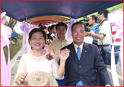 中新網8月1日電 據《中央日報》報道,“2005臺中縣兩馬觀光季”“喜事連連愛相隨幸福久久集體婚禮”昨天(31日)在臺中縣后豐鐵馬道9號隧道口的夫妻樹廣場舉行,臺中縣長黃仲生夫婦與縣“議會”副議長陳芳隆共同為24對新人福證,隨后新人們搭乘電動小火車暢游9號隧道及花梁鋼橋,與歷史共同做見證。
