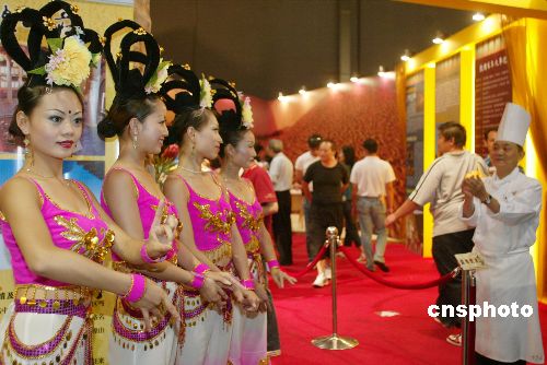 八月七日,在臺北世貿中心進行的二○○五年臺北“中華美食節”進入最后一天,眾多臺北市民抓住最后一天的時間,到美食節參觀、品嘗美食,來自甘肅省的敦煌風情宴成為美食節一大亮點,更有“飛天舞女”助興。作者:盛佳鵬