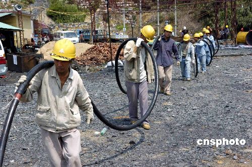 十一日,廣東興寧大興透水煤礦再加裝從河南省調來的九百千瓦大功率潛水泵,以加快井下排水進度。圖為搶險人員在為大功率水泵鋪設電纜。作者:羅仰明