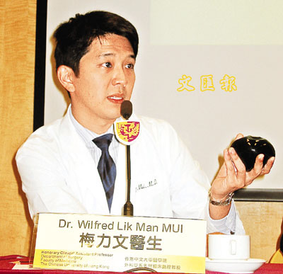 外科學系名譽臨床助理教授梅力文介紹說,胃球可注入500立方厘米的鹽水,最大直徑達15厘米。手術只花30分鐘,水球可放于胃內6個月,并可還原或重置水球,副作用極少。
