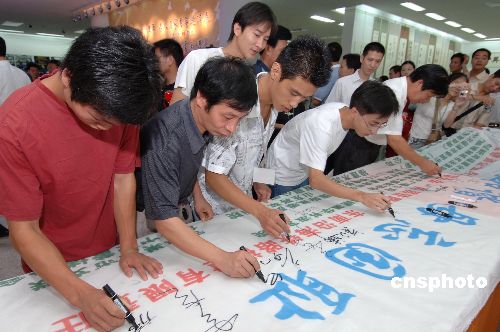為紀念抗日戰爭勝利六十周年、推動祖國和平統一大業,以“兩岸攜手、同紀抗戰、共建和諧、共謀發展”為主題的《紀念抗日戰爭勝利六十周年名人名家書畫邀請展》,八月十四日在福州畫院隆重開展,主辦方還舉行“兩岸攜手,共建和諧;毋忘國恥,振興中華”百米長卷,萬人簽名活動。作者:劉可耕