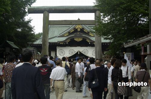 八月十五日一大早,不少日本人來到位于東京市中心的靖國神社參拜。據日本共同社報道,日本首相小泉純一郎當天上午前往千鳥淵戰歿者墓苑敬獻花圈,預計當天不會前往靖國神社。作者:王健