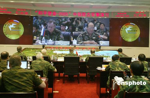 2005年8月21日15時(shí)50分,對(duì)“和平使命—2005”中俄聯(lián)合軍事演習(xí)來說,是一個(gè)重要的時(shí)刻。中俄聯(lián)合軍事演習(xí)中方總導(dǎo)演葛振峰上將和俄方總導(dǎo)演莫爾堅(jiān)斯科伊上將,共同批復(fù)了此次軍演的聯(lián)合戰(zhàn)役決心書和決心圖。