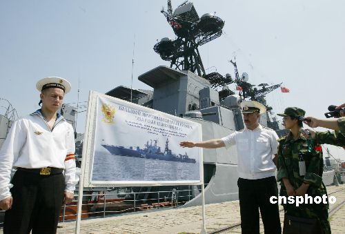 八月二十二日,中國(guó)部分媒體被中俄軍事演習(xí)俄軍方邀請(qǐng),參觀采訪此次參加演習(xí)的俄羅斯反潛艦,這艘停靠在青島港的艦艇正整裝待發(fā),明日將起航參加海上封鎖演習(xí)。圖為該反潛艦艦長(zhǎng)介紹艦艇的性能和裝備情況。作者:王麗南