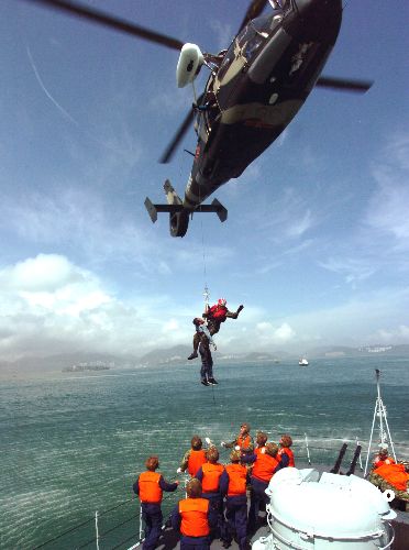 中國人民解放軍駐香港部隊22日在香港南丫島東澳灣參加由特區政府組織的2005年度海上空難搜救演習﹐直升飛機將人從海面救起﹐送上導彈護衛艇。作者:趙振清