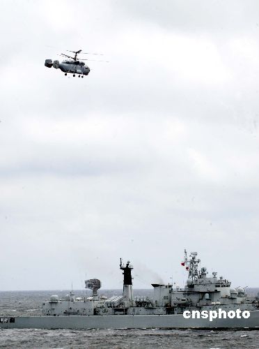 二十三日,“和平使命——2005”中俄聯(lián)合軍事演習(xí)第三階段——實施交戰(zhàn)的海上封鎖演練在中國黃海海域進行。圖為直升飛機釋放聲納,搜尋潛艇,與艦艇聯(lián)合反潛。作者:王麗南