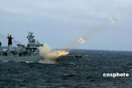 八月二十三日,“和平使命-2005”中俄聯(lián)合軍事演習第三階段——實施交戰(zhàn)的海上封鎖演練在中國山東半島及其附近海域開始。圖為中國驅逐艦發(fā)現(xiàn)目標后發(fā)射火箭彈。作者:王麗南