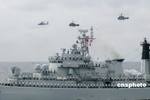 “和平使命-2005”中俄聯(lián)合軍事演習(xí)第三階段8月23日在中國山東半島及其附近海域舉行。圖為中俄艦機(jī)編隊(duì)接受聯(lián)合導(dǎo)演部檢閱時,中方艦艇駛過觀摩艦時情景。作者:王麗南