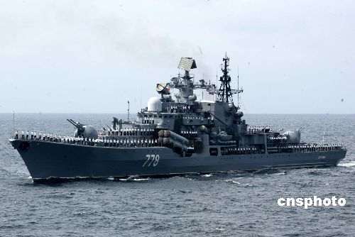 “和平使命-2005”中俄聯合軍事演習第三階段8月23日在中國山東半島及其附近海域開始。圖為參加演習的俄艦艇,接受聯合導演部檢閱。作者:王麗南