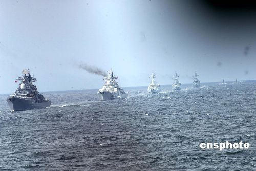 “和平使命-2005”中俄聯合軍事演習第三階段8月23日在中國山東半島及其附近海域舉行。圖為參加演習的中俄艦艇形成隊列,接受聯合導演部檢閱。作者:王麗南
