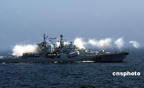 8月23日,“和平使命——2005”中俄聯合軍事演習第三階段---實施交戰的海上封鎖演練。圖為中國海軍驅逐艦釋放電磁干擾彈,抗擊來襲導彈。作者:王麗南