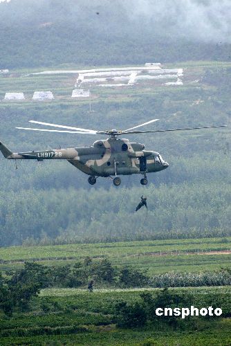 八月二十四日,“和平使命—2005”中俄聯合軍事演習第三階段兩棲登陸作戰實兵演練在山東半島展開。圖為中國特戰隊員實施繩降。作者:王麗南
