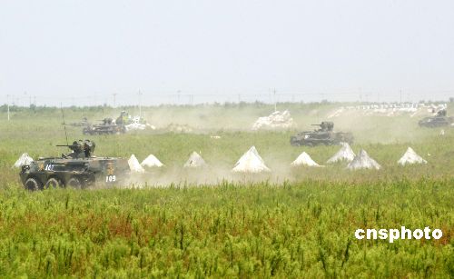“和平使命——2005”中俄聯合軍事演習強制隔離演練8月25日在在山東半島舉行。圖為聯合演習部隊裝甲車密集炮火攻擊敵機場,消滅機場頑敵。作者:王麗南