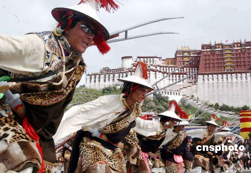 八月二十八日,西藏自治區成立四十周年大型游行彩排活動在拉薩舉行,圖為藏族人民在布達拉宮廣場盛裝起舞。作者:張宇