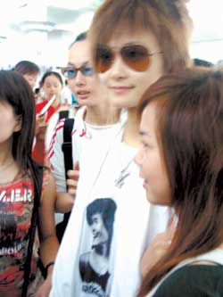 聽一位“玉米”說,他們昨天一直守在李宇春門口,她3點多才回住處,又要收拾東西,才睡了一個小時。昨天早上7點30分左右,李宇春出現在機場(其他超女坐下一班飛機),她確實是沒休息好的樣子,雖然一直在和歌迷微笑,卻掩蓋不住一臉疲憊。她穿了一件歌迷送的白色長袖外套,里面是一件印有自己頭像的白色T恤,據說這是北京的“玉米”們為她訂做的,李宇春想讓北京歌迷高興一下。