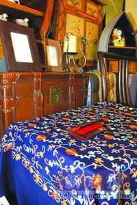 藏式風格的桌布給人感覺最多的是拙樸。這家店里的桌布大多是厚重的顏色,常見的是明黃。材質是很厚重的純棉,桌布上的圖案大多是西藏、尼泊爾風格的民族圖案,手工不一定精致,但是足夠野性。圖案不是簡單的花朵,而是都有著另外的意義。店主隨便拿出一條,上面手工刺著吉祥鳥、大象、駱駝、太陽、男人和女人。圖形簡單,卻意味深長,有著良好的祝愿,有著原始的味道。