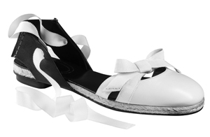 2、絲緞:絲緞是本季平跟鞋的裝飾關鍵,最酷的是襪式夾趾平跟涼鞋,其次是穿插鞋幫的絲帶裝飾,最可愛優雅的是絲緞蝴蝶結裝飾。