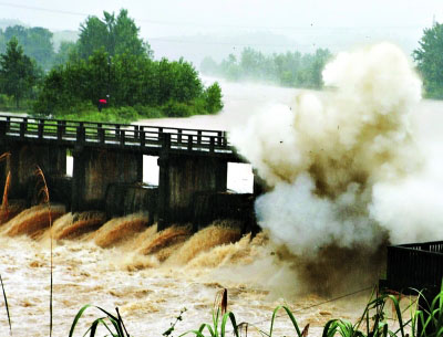 當(dāng)日,咸寧市咸安區(qū)馬橋鎮(zhèn)高賽水電站的攔水壩實(shí)施爆破泄洪。受強(qiáng)降雨影響,咸寧市南川水庫(kù)水位超過(guò)警戒線,水庫(kù)下游至馬橋鎮(zhèn)高賽水電站間部分地區(qū)出現(xiàn)內(nèi)澇。咸安區(qū)防汛指揮部決定爆破高賽水電站的部分?jǐn)r水壩,確保南川水庫(kù)及時(shí)泄洪。新華社發(fā)(鄧東峰攝)