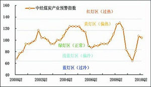 預警:2010年二季度,中經煤炭產業預警指數為103.3點,比上季度下降3.4點,在“綠燈區”內小幅回落。這主要因為產品銷售收入同比增速出現逆轉,產量有所下降等。