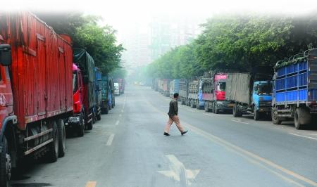 昨日,南岸白鶴路,貨運市場外的道路兩旁停滿了受柴油拖累無法上路行駛的大貨車。本組圖片由首席記者 鐘志兵 攝財經調查