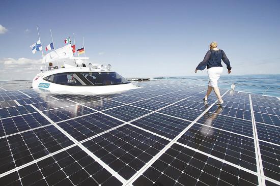12月8日,在墨西哥坎昆,一名婦女行走在以太陽能為動力的“星球陽光”號雙體船的甲板上。“星球陽光”長31米、寬15米,被制造商稱為世界上最大的太陽能動力船。 新華社發