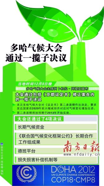 經(jīng)過一天一夜的“加時”鏖戰(zhàn),多哈氣候大會終于在當(dāng)?shù)貢r間8日晚上通過一攬子決議,戲劇般地落下帷幕。會議決定從2013年開啟《京都議定書》第二承諾期,為期8年。此外,會議還決定到2015年時達成一個涉及所有國家的有關(guān)2020年后全球應(yīng)對氣候變化行動的協(xié)議,并重申發(fā)達國家應(yīng)當(dāng)為發(fā)展中國家應(yīng)對氣候變化提供資金支持。