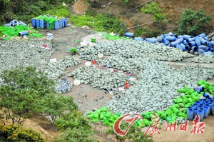 近日,有熱心讀者致電廣州日報稱一個地下金屬回收廠藏身于布吉南灣一處山坳里,留意觀察才發現里面的人用明火和強酸提煉各種金屬,近百桶裝滿各種腐蝕性、強酸性的化學品就堆放在一個雨棚下面,對周邊環境危害很大。1月25日上午,記者驅車從吉廈工業園內經過一段崎嶇不平的山路,才在一處山坳里找到這處極其隱蔽的地下金屬回收廠。